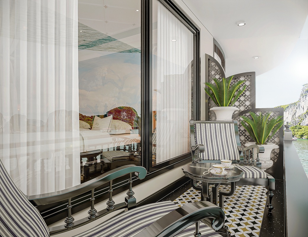 Spanning a large space of 36 square meters each, the Saigon Grand Suites are located on the third deck, each featuring a private balcony, bathtub and full-view windows that offer stunning vistas for guests. The bedrooms are equipped with five-star standard amenities, showcasing meticulously designed Indochine-style interiors. Each room is adorned with decorative artworks that reflect aspects of the lives of the intellectual elite and officials in the 1930s. The elegant decor creates an atmosphere of sophistication and charm, inviting guests to immerse themselves in the rich cultural heritage of the era