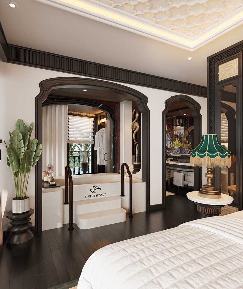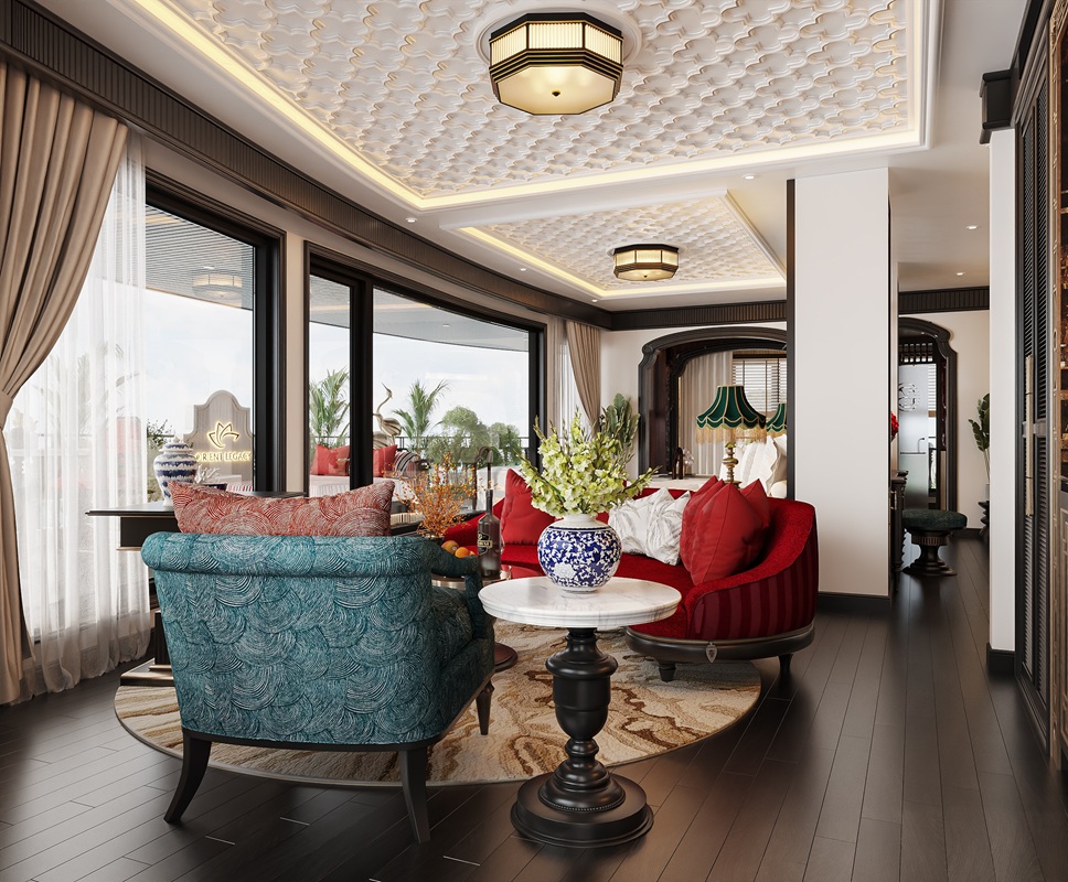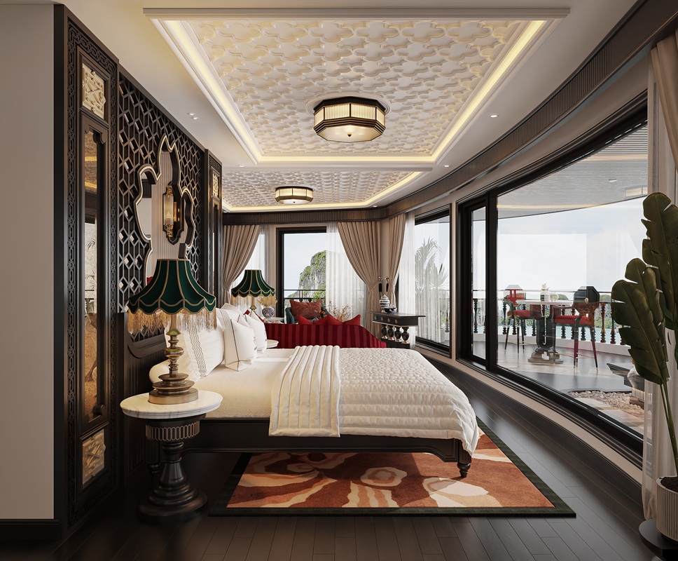 The most luxurious accommodation aboard the Orient Legacy Cruise, this 60 m2 (861 ft2) suite is likened to a sky villa amidst the sea. Located on the third deck, it boasts a unique semi-circular design with panoramic 180-degree ocean views and a spacious 40 m2 (430 ft2) balcony equipped with sun loungers and an outdoor jacuzzi. The king-size circular bed stands out like an “island” in a space that is both elegant and cozy, with a bathtub overlooking the stunning heritage scenery. Lavish interiors and top-tier amenities include a personal bar with a variety of drinks and snacks, and private balcony breakfast service—all designed for discerning and sophisticated guests, treated like royalty.