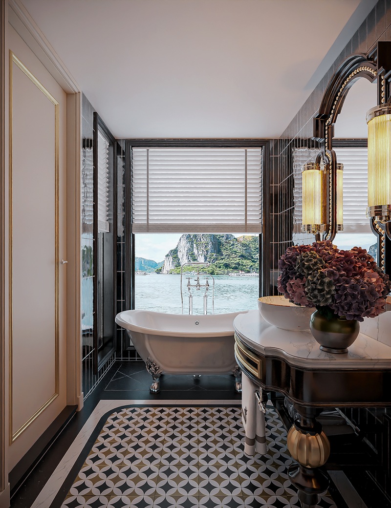 Spanning a large space of 31 square meters each, the Saigon Suites are located on the third floor, each featuring a private balcony, bathtub and full-view windows that offer stunning vistas for guests. The bedrooms are equipped with five-star standard amenities, showcasing meticulously designed Indochine-style interiors. Each room is adorned with decorative artworks that reflect aspects of the lives of the intellectual elite and officials